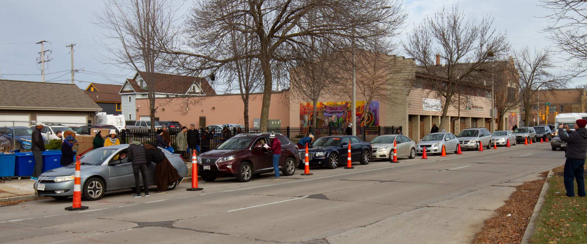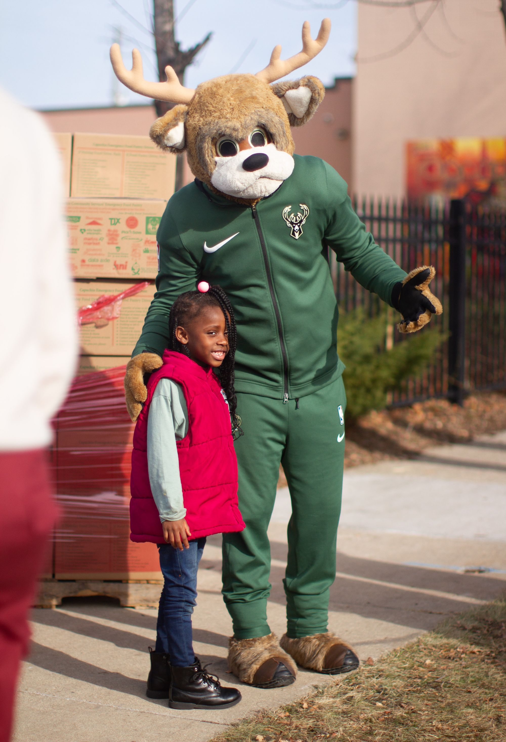 Our November 2022 Thanksgiving distribution included representatives from the Milwaukee Bucks and Gruber Law. Bango, the Bucks mascot, was on-hand to help distribute food to guests.